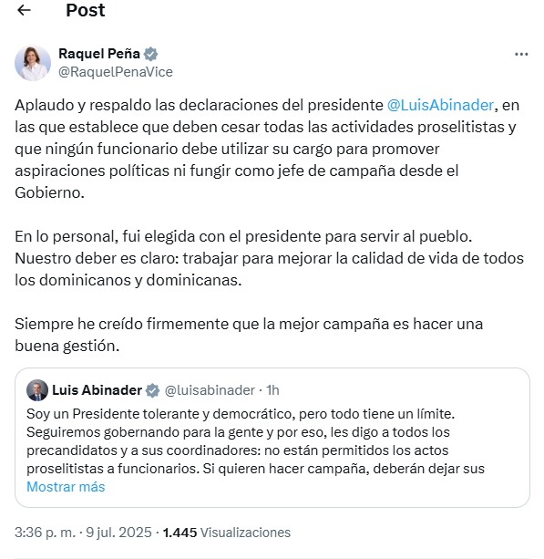 “En lo personal, fui elegida con el presidente para servir al pueblo. Nuestro deber es claro: trabajar para mejorar la calidad de vida de todos los dominicanos y dominicanas. Siempre he creído firmemente que la mejor campaña es hacer una buena gestión”, escribió la vicepresidenta.